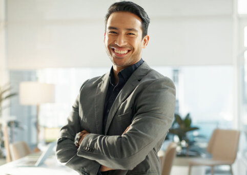 A man wearing a dark green suit, smiling towards camera with his arms folded - Master of Professional Accounting (MPA) - 724x454