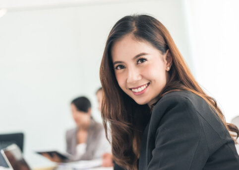 Smiling woman sitting in a therapy session, facing towards camera