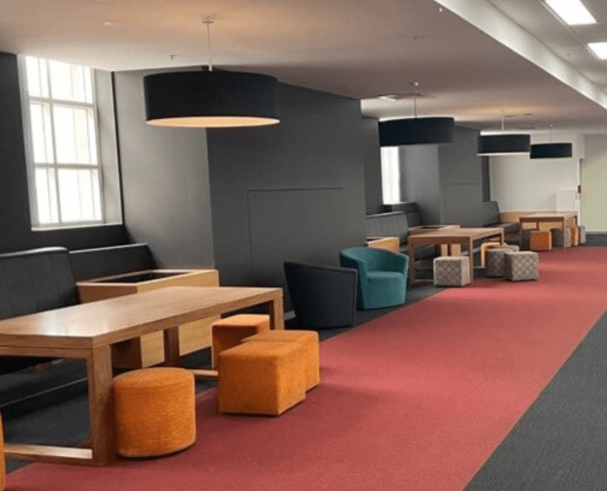 - Multiple break-out spaces, including lounges and study areas with USB ports
